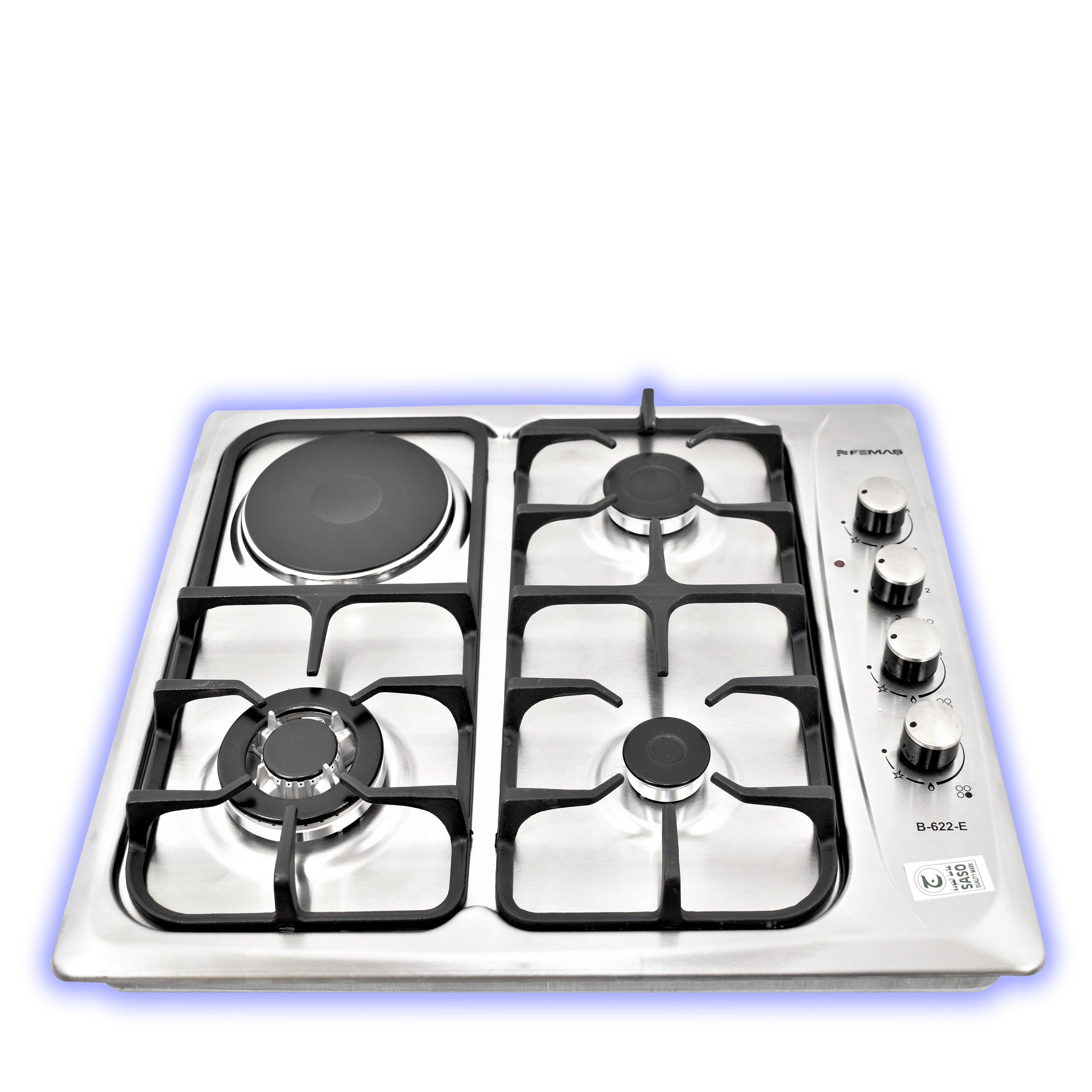 سطح فيماس استيل 60*60 ثلاث عين غاز واحد عين كهرب وصف المنتجإشعال علوي للشعلات من المفتاح نفسه غطاء الشعلات من الحديد الزهر الثقيلحمالات من الحديد الزه...