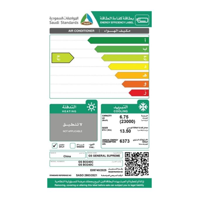 جنرال سوبريم، مكيف سبليت أونيكس، انفيرتر، 23,000 وحدة، تحكم واي فاي، ريش ذهبية، تبريد تيربو، توزيع هواء(3D)، أسود. GSBO240Cالمواصفاتالفولت / هرتز : ۲۳...